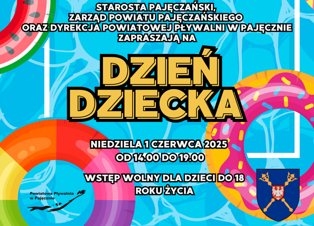 W imieniu Starosty Pajęczańskiego, Zarządu Powiatu Pajęczańskiego oraz Dyrektora Powiatowej Pływali w Pajęcznie zapraszamy i zachęcamy wszystkie dzieci i młodzież zamieszkałą na terenie Powiatu Pajęczańskiego, do skorzystania z darmowego wstępu na Powiatową Pływalnię w Dniu Dziecka 1 czerwca 2025 (niedziela). Wejścia będą możliwe w godzinach 14.00 – 19.00. Dzieci do lat 10 wchodzą wyłącznie z pełnoletnim opiekunem. Zapraszamy!!!