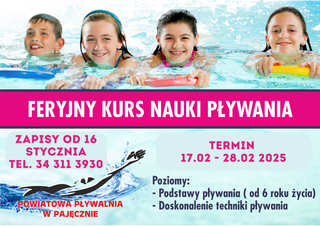 Zapraszamy do zapisów na Feryjne Kursy Nauki Pływania, jakie przygotowujemy dla dzieci i młodzieży w czasie zimowej przerwy feryjnej w 2025 roku. Zajęcia prowadzone będą dla dzieci początkujących w wieku od ukończonych 6 lat oraz dla dzieci doskonalących umiejętności. Zapisy prowadzimy telefonicznie pod numerem 34 311 39 30 lub w kasie pływalni od 16 stycznia do wyczerpania się miejsc. Koszt kursu 230 złotych. Ilość miejsc ograniczona.